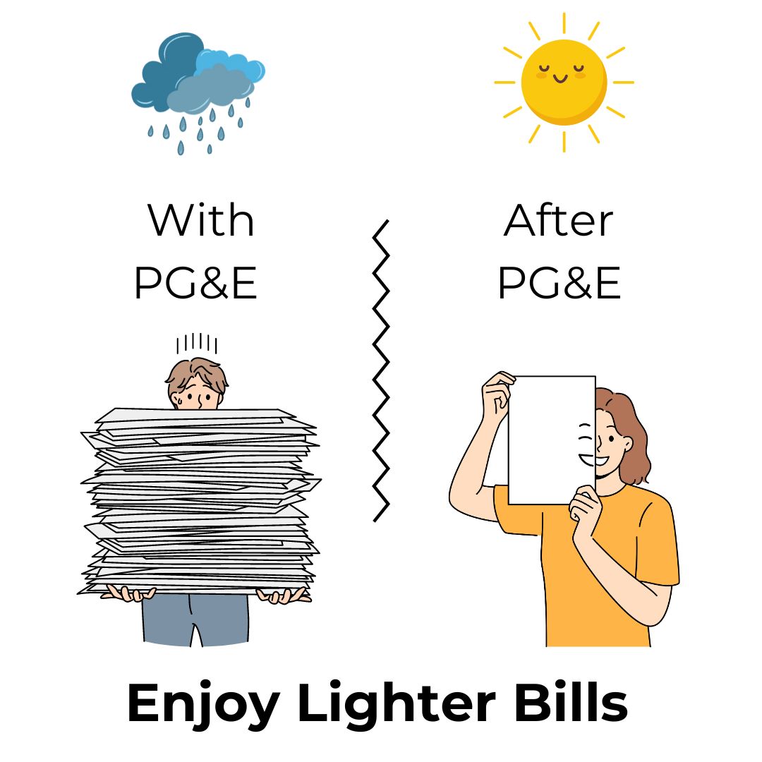 Say goodbye to PG&E, their constant rate increases, and unreliable service. Get predictable power savings and put money in your pocket immediately!